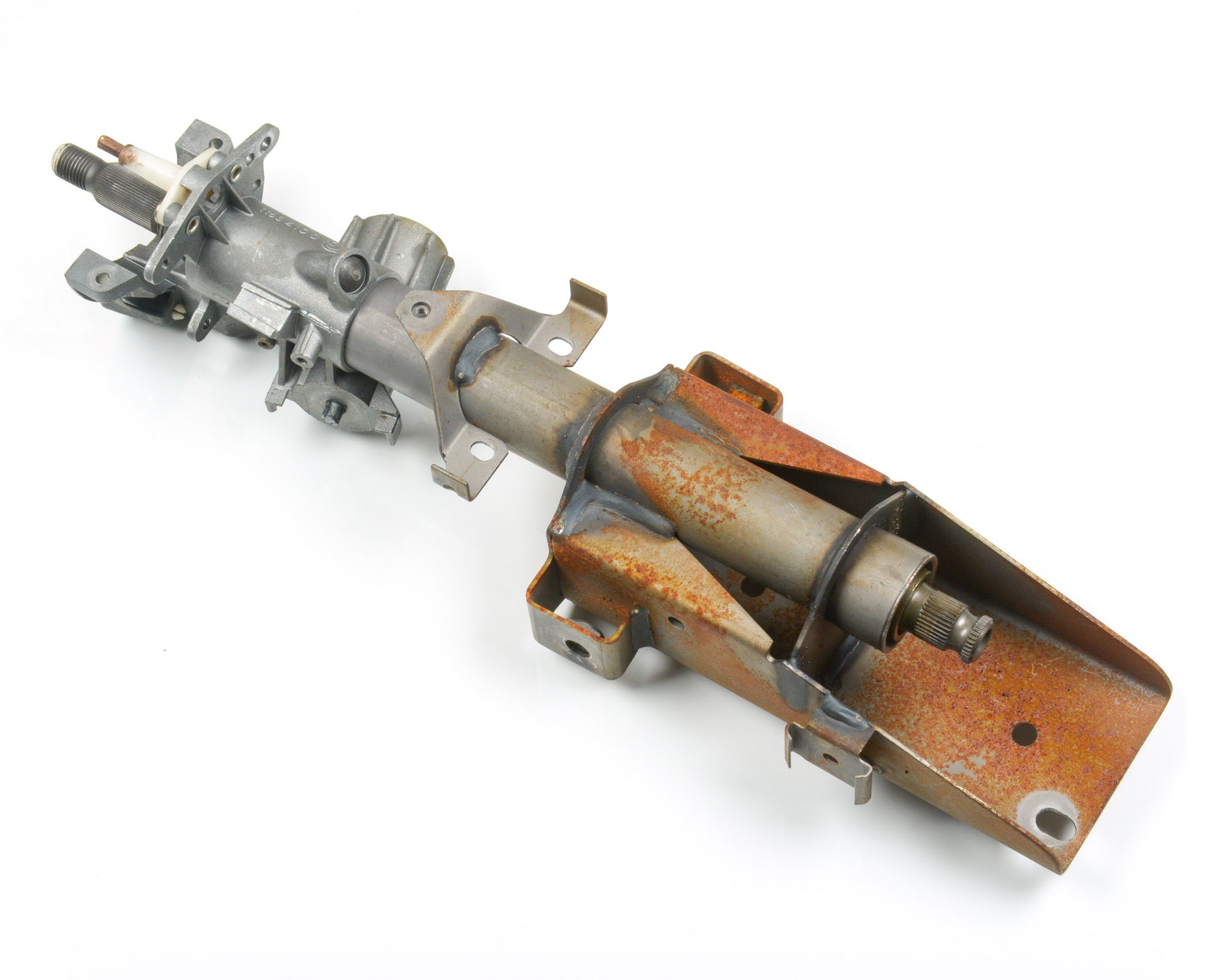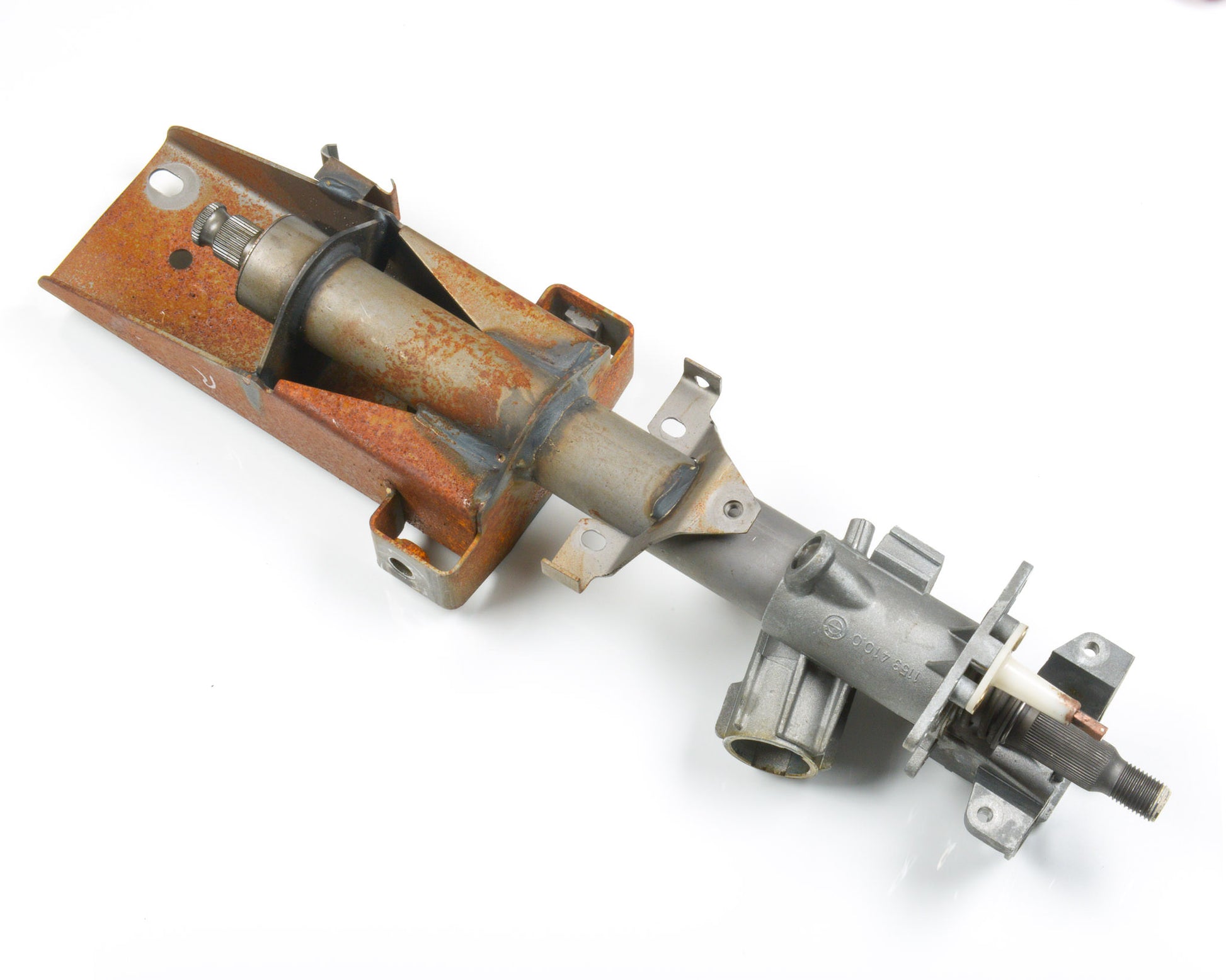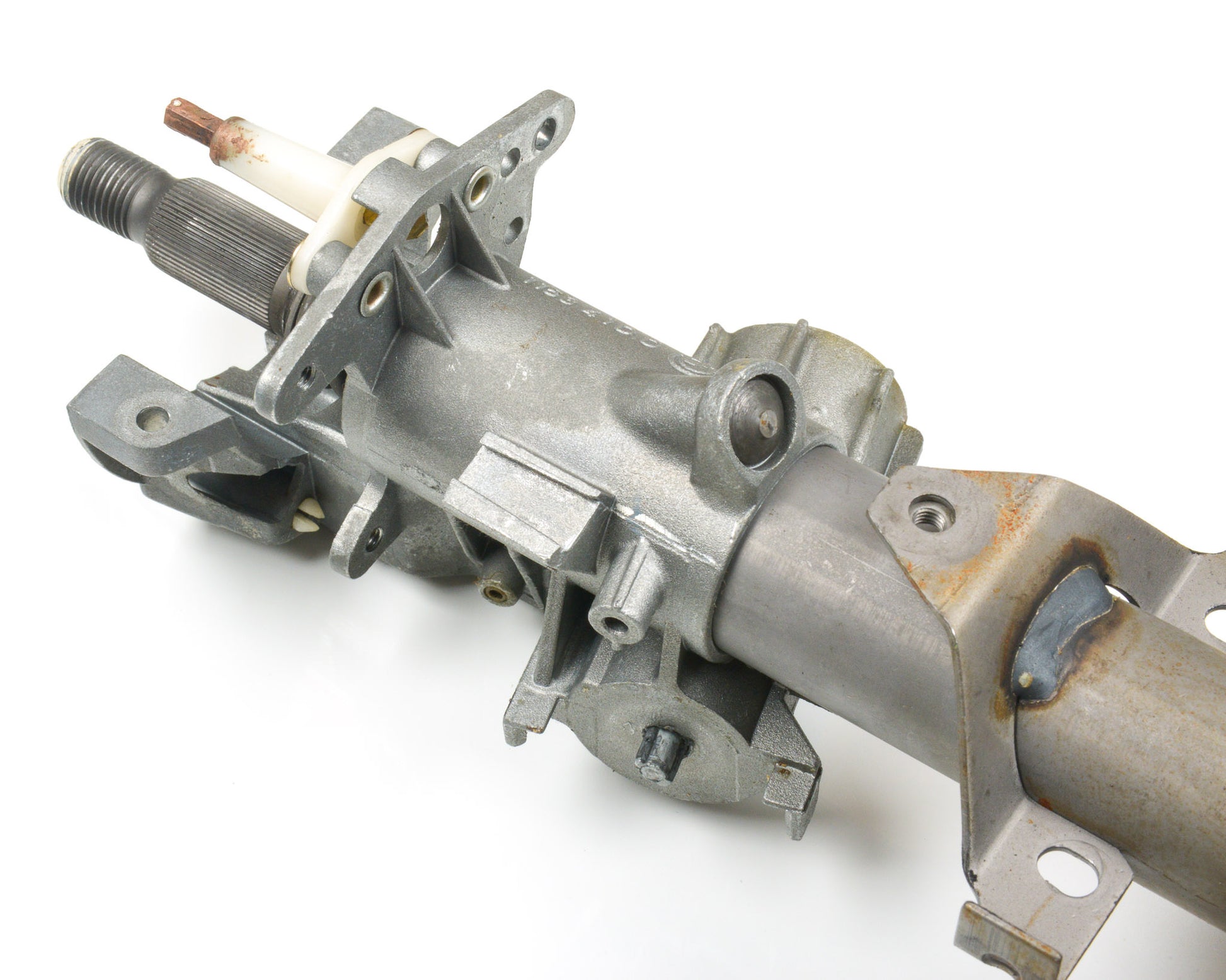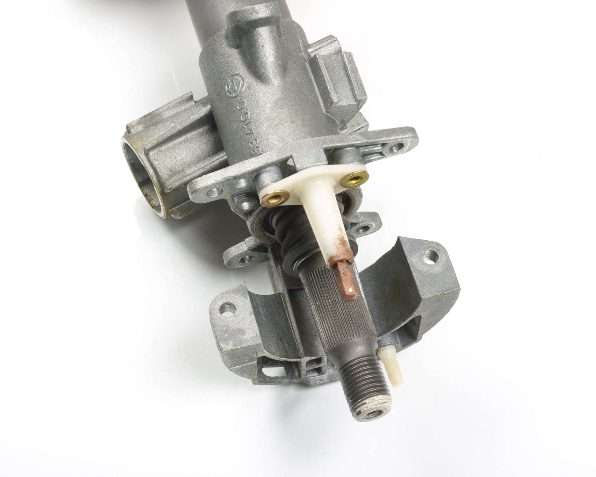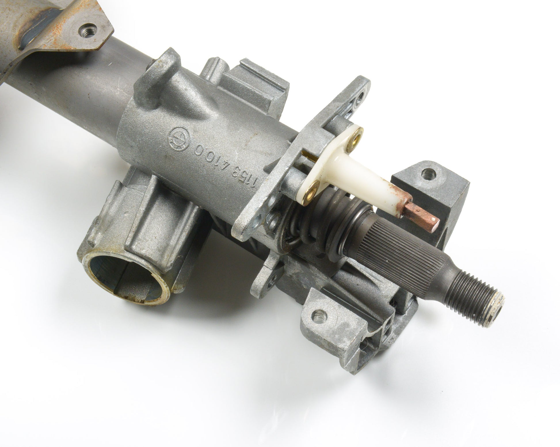 BMW E30 Upper Steering Spindle Bracket Assembly for SRS Airbag E30 ONLY. This is in good working order as pictured. The mounting tabs for all three steering column switches are intact, and ignition lock housing functions properly as shown.